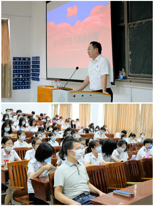 (国际邮轮游艇学院 供稿) 为深入领会习近平总书记在庆祝中国共产党成立100周年大会上的重要讲话精神,深入开展党史学习教育,9月23日下午,副校级领导袁炎清教授深入国际邮轮游艇学院,在教学楼110讲授“奋斗百年路,启航新征程”主题思政课。学院党委书记陈驰、纪晓曦博士现场聆听了讲课,学院分团委书记张少敏主持讲座。