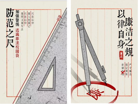 作品《廉洁尺规,自在心中》紧扣廉洁教育主题主线,把清廉元素融入创意设计,匠心设计了廉洁之尺、廉洁之规。作品采用红色与黑白灰相间的配色组合,红色代表警示,黑白灰则代表着严肃、严谨及规范,以此来烘托廉洁自律、坚守红线的主题。黑色字体与浅色背景形成强烈的警示作用。作品还融入了书信元素,引导师生重视自律自省,强化同防共治,携手同行,共创清廉文明的校园文化环境。
