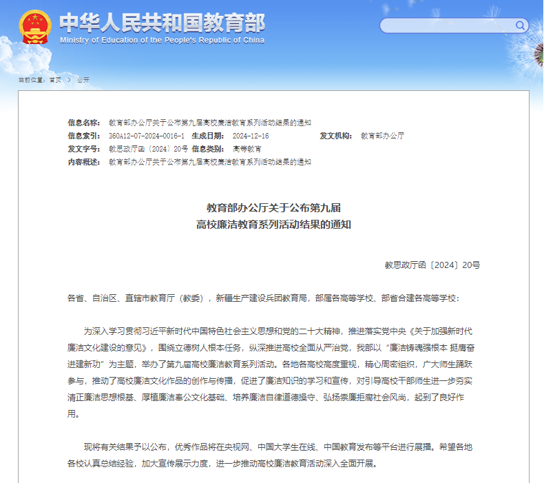 此次活动由教育部思想政治工作司主办,教育部宣传教育中心、中国政法大学承办,活动以“廉洁铸魂强根本 挺膺奋进建新功”为主题,细分“话廉润心”校园征文、“视廉清心”视频征集、“画廉正心”创意征集等6个单元,旨在引领高校师生进一步夯实清正廉洁的思想根基、厚植廉洁奉公的文化基础、培养廉洁自律的道德操守、弘扬崇廉拒腐的校园风尚,把廉洁教育贯穿于办学治校、教书育人、养德修身的全过程各方面。