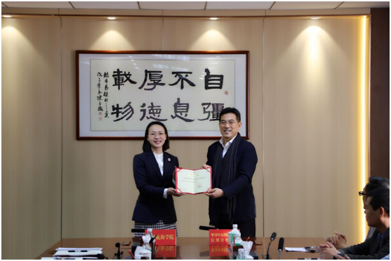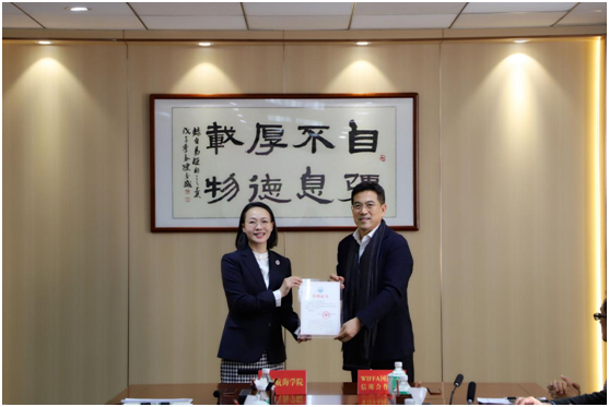 座谈会上,陶韶菁代表学校向WIFFA理事长、中国物流与采购联合会国际货代分会会长康树春、WIFFA华南片区高管及会员单位代表的莅临到访表示热烈欢迎,向WIFFA慷慨捐资百万助力我校教育事业高质量发展表示衷心感谢。为进一步汇聚创新资源,推进产学研一体化合作交流,在捐赠环节之后,陶韶菁代表学校为康树春先生佩戴校徽并颁发客座教授聘用证书。