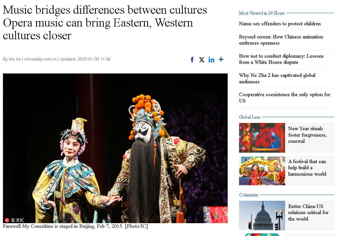 1月30日,beat365中文官方网站外国语学院吴珂老师在《China Daily》刊发理论文章《Music bridges differences between cultures Opera music can bring Eastern, Western cultures closer》。