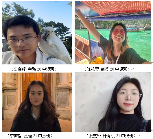 史璟程,进入悉尼科技大学学习。悉尼科技大学的开放式校园设计和现代化的教学设施让他印象深刻,注重互动与独立思考的讨论式课堂更让他惊叹。陈泳莹,前往欧洲应用科技大学学习。欧洲应用科技大学提供了高质量的教育资源和丰富的课程选择,严谨的教学风格和注重互动的课堂让她受益匪浅。李安哲,进入佩鲁贾外国人大学学习。从古老的城墙到中世纪的教堂,佩鲁贾充满了艺术气息。在与来自世界各地的同学交流中,她不断拓展国际视野,深入了解不同文化的魅力。张艺华,前往悉尼科技大学学习。她以开放的心态拥抱语言、文化和独立生活的全新体验,并很快融入了当地的学习与生活节奏,让她更加坚定了前行的步伐。