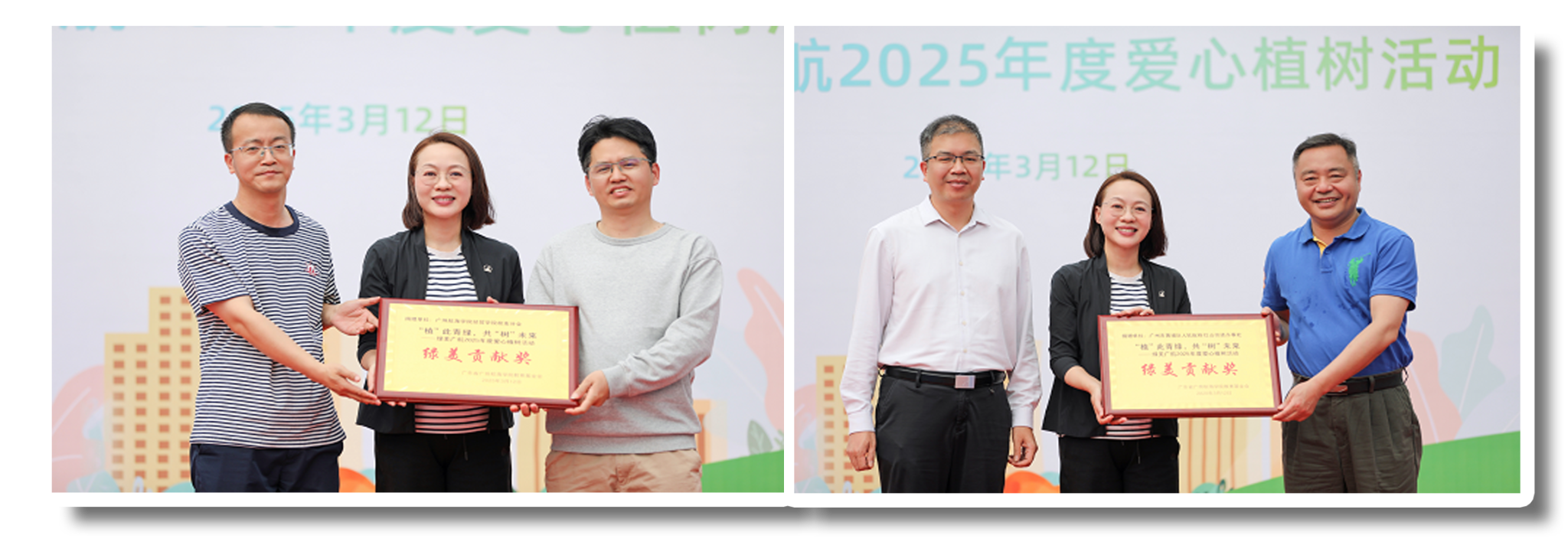 本次爱心植树活动得到了广大校友及社会各界的大力支持,共收到认捐树木800多株,折合人民币近百万元,其中多为风铃木。陶韶菁代表学校对此表示感谢,并为捐赠单位及个人颁发牌匾。广州澳企实验室技术股份有限公司董事长郭洪臣、马可波罗控股股份有限公司工程一部总经理杜然、深圳校友分会会长、港航商务与管理专业1995级校友甘建军、交通学院校友分会副会长、港口经济管理专业1987级校友吴永明、中铁建工集团有限公司、中铁建工集团湾区公司、广州湾区建工总经理周陈伟、黄埔区红山街道党工委书记凌伟东作为捐赠代表发言时表示,十年树木,绿美广航郁郁葱葱,植绿护绿意义重大;百年树人,广航学子朝气蓬勃,奋发图强报效祖国。