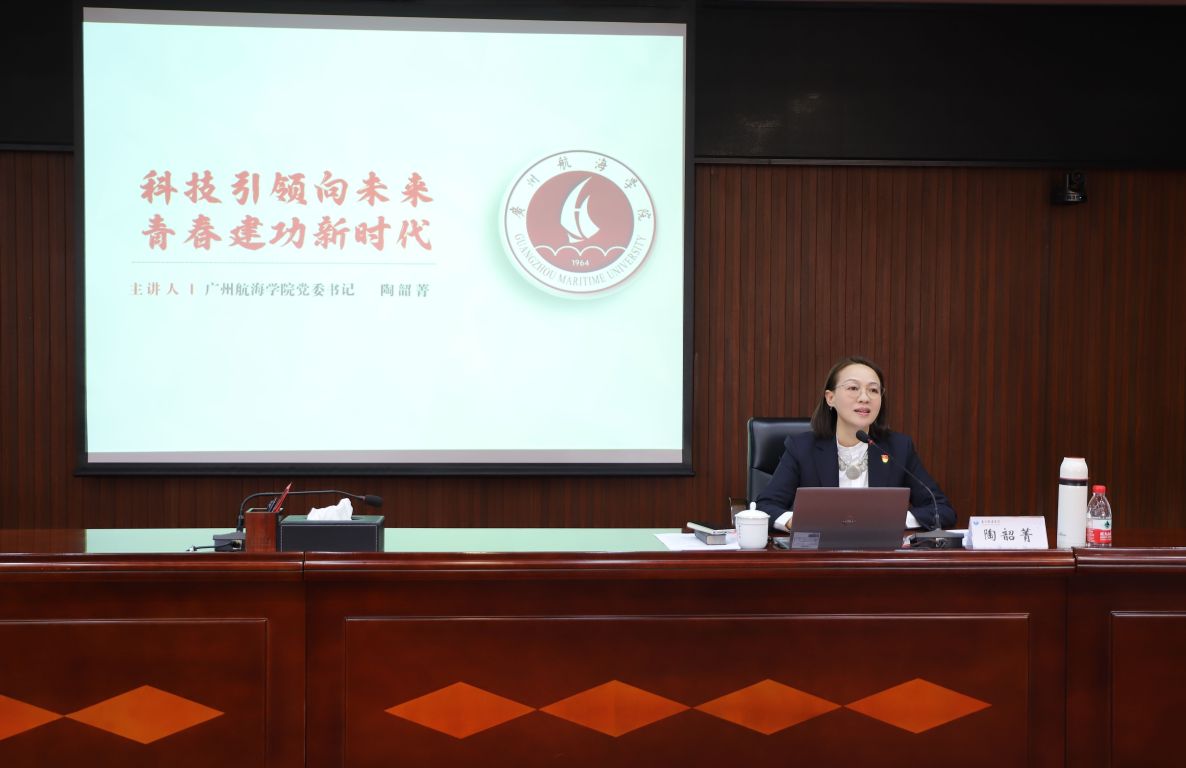 开班仪式结束后,陶韶菁以《科技引领向未来,青春建功新时代》为题讲授党课、思政第一课,带领同学们深入学习习近平总书记在2025年全国两会期间的重要讲话精神和对海洋强国、交通强国、教育强国建设的重要指示,并以科技发展为线索,从“创新基因如何深植我国海洋文明血脉”“科技革命如何重构海洋产业版图”“国家与区域在海洋强国上的战略部署”和“向海图强进程中的广航贡献”四个方面深入浅出地阐释了“强于天下者必胜于海,衰于天下者必弱于海”的规律,讲述了广航人用青春书写的家国情深故事,激励广航学子坚定向海图强、建功蓝海的信念。