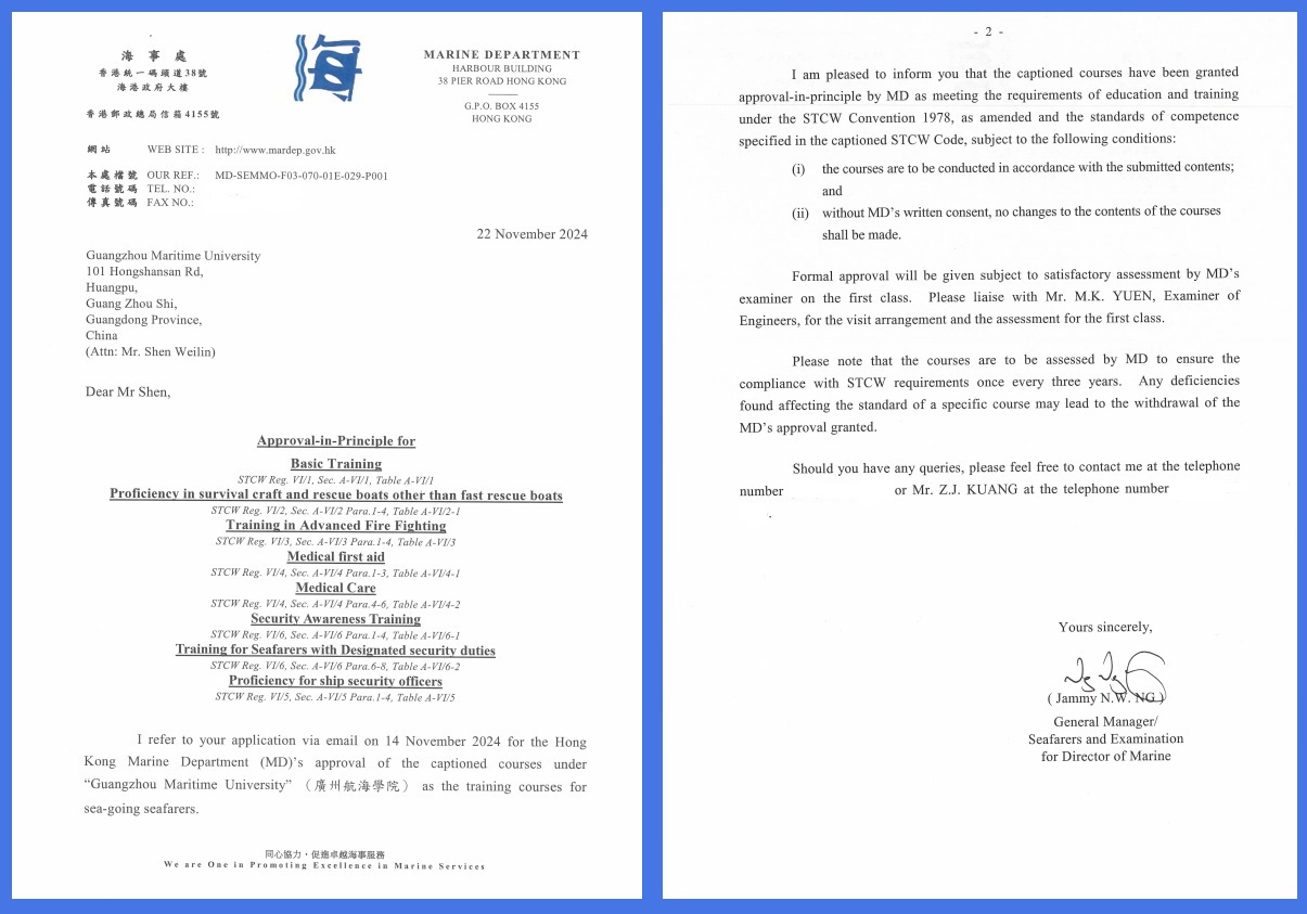 近日,中国香港特别行政区政府海事处(下称:香港海事处)致函学校,正式确认学校海船基本安全培训和高级消防培训、精通救生艇筏和救助艇培训等海船船员专业技能适任培训共8项船员培训项目获得认证。学校船员培训项目首次获得香港海事处官方认证,意味着香港藉船员可凭学校船员培训结业证书向香港海事处申领船员培训合格证。此次认证不仅是对学校船员培训项目专业性的高度认可,也标志着学校在航海专业人才培养领域的教学质量和实践能力达到国际质量标准,为学校服务于粤港澳大湾区航运人才培养,助力交通强国建设,赋能粤港澳大湾区航运高质量发展打下坚实的基础。