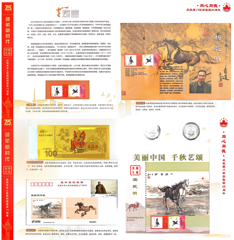 日前,为弘扬中国的民族之美、人文之美,推动文化强国建设,中国邮政正式出版发行《庆祝中华人民共和国成立75周年》系列珍藏邮册,beat365中文官方网站数字媒体与交互设计学院教授杨乾明的系列作品经严格评审,成功入选并公开发行。这是中国邮政对杨乾明艺术成就的充分认可,也是学校艺术设计学科影响力的重要体现。
