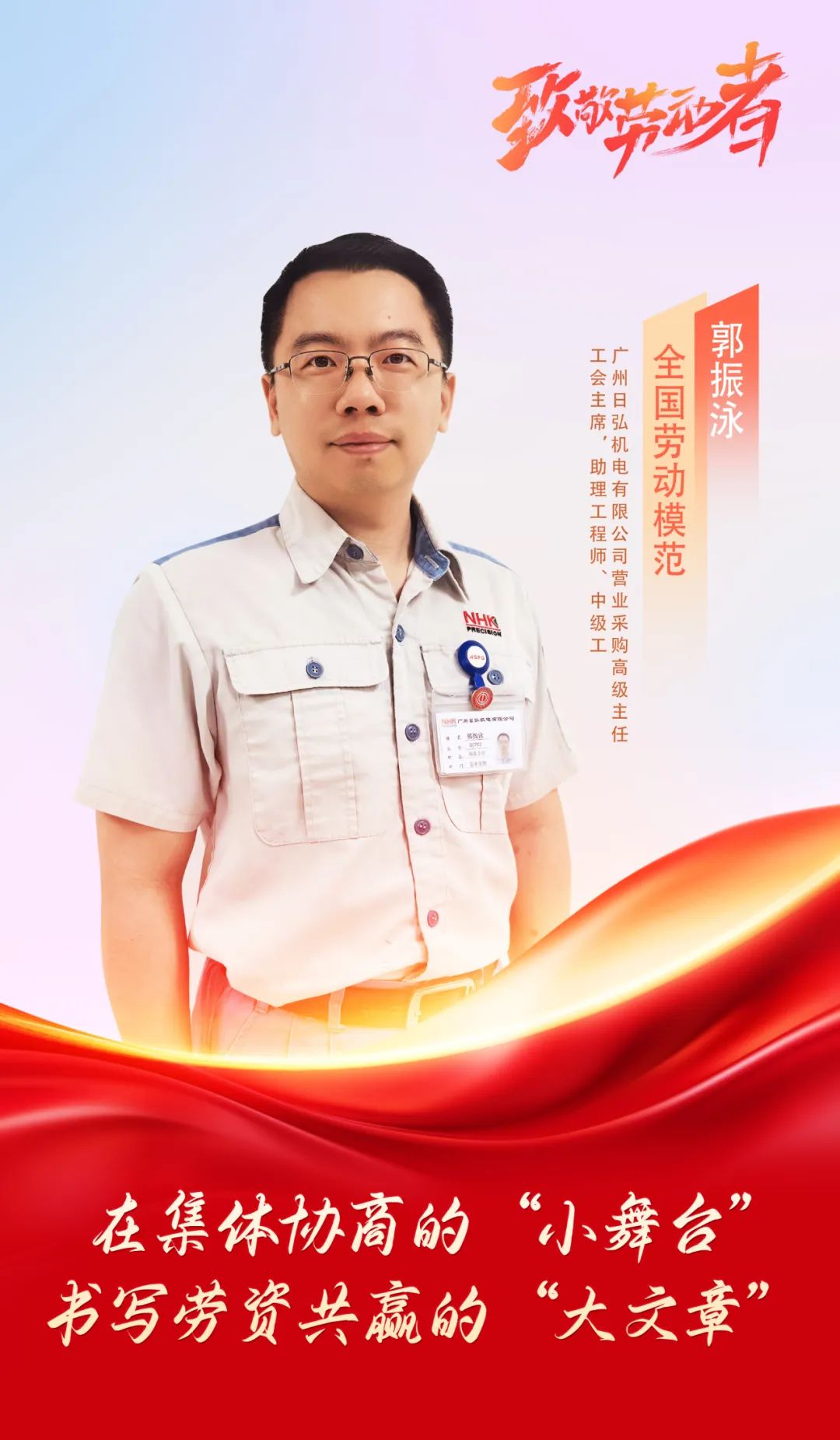 扎根基层,创新突破。郭振泳现任广州日弘机电有限公司营业采购高级主任、工会主席,同时担任助理工程师和中级工。工作十余年,他始终做到初心如磐、使命在肩,锐意进取、善作善成,在工会工作领域不断创新突破,为新时代和谐劳动关系做出积极贡献。此前,他已先后荣获“广东省五一劳动奖章”“全国工会系统劳动模范”等称号,此次获评“全国劳动模范”既是对他多年来坚守与付出的肯定,更是对他砥砺前行的激励和鞭策。