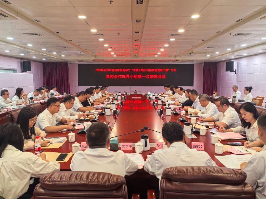 近日,2025年开平市“双百行动”县校合作领导小组第一次联席会议在开平市召开,学校党委书记陶韶菁出席会议并讲话,开平市委副书记、市长陈小曼,开平市政协党组书记、主席、市“百千万工程”指挥办主任关耀东,江门职业技术学院党委书记张忠林参加会议。
