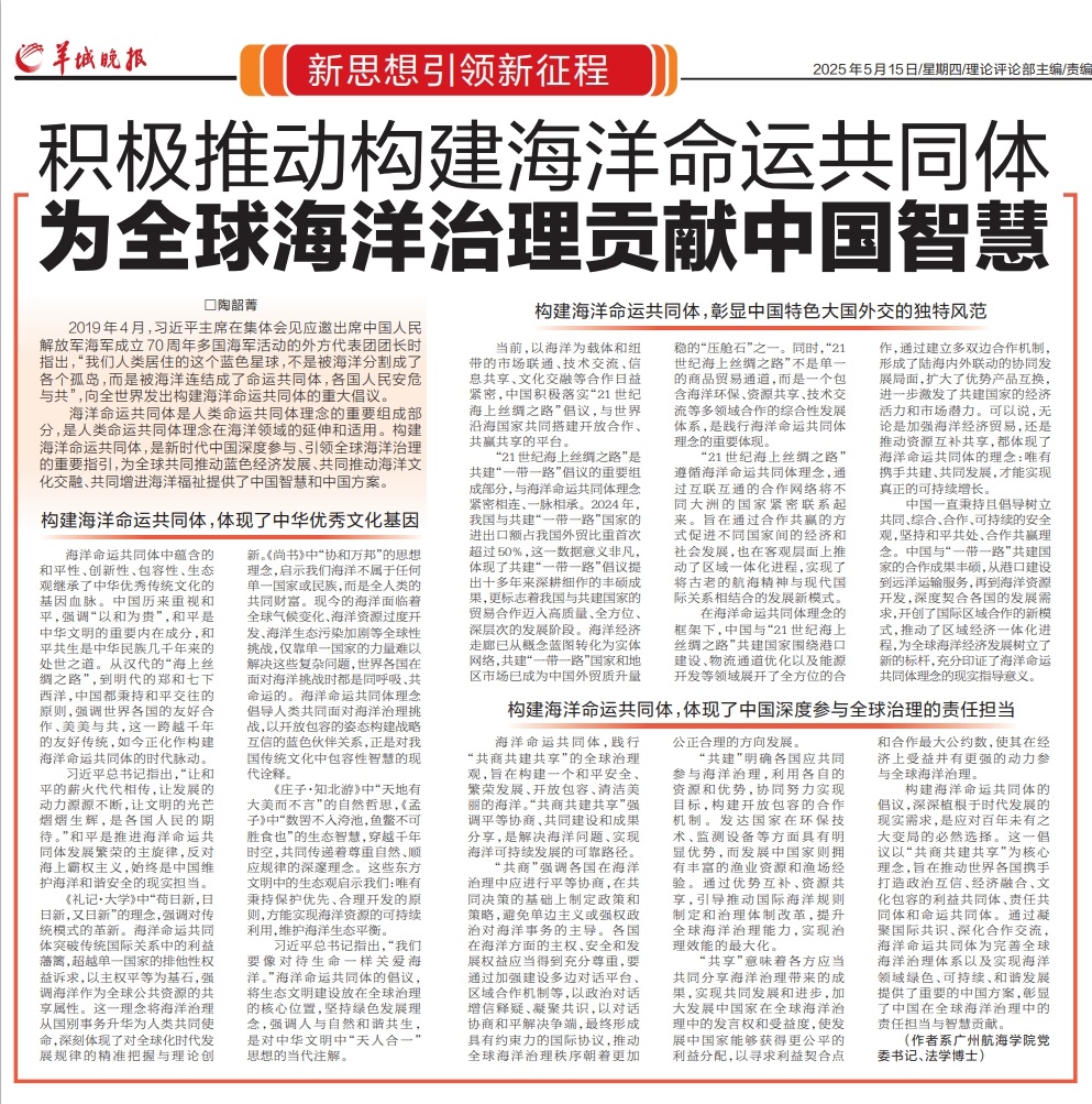 近日,学校党委书记陶韶菁的理论文章《积极推动构建海洋命运共同体 为全球海洋治理贡献中国智慧》先后在《羊城晚报》和“广东学习平台”刊发,引发广泛关注。文章深入阐释了构建海洋命运共同体的中国方案,展现了学校在海洋治理研究领域的学术引领力与社会影响力。