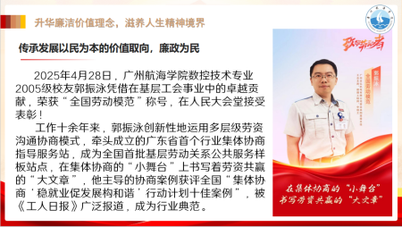 讲座聚焦传统文化中的廉洁价值,生动阐释了“以民为本”“大公无私”的精神内核,并用校友郭振泳的先进事迹展现了新时代青年廉洁担当;讲座挖掘岭南廉洁基因,通过孙中山、詹天佑、庄有恭的先贤故事,激励青年学子传承湾区廉洁传统;讲座还以一系列90后贪腐典型案例为反面教材,警示广航学子抵制奢侈消费、学术失信、弄虚作假等不良现象。