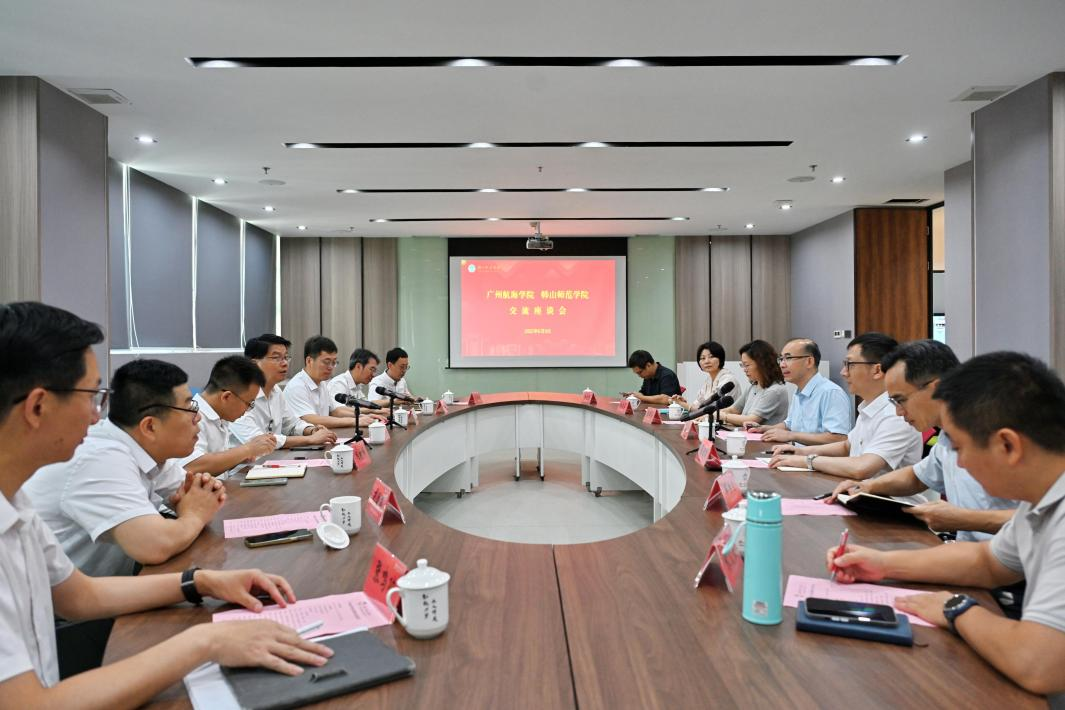 会上,张劲文对韩山师范学院的热情接待表示诚挚感谢。他充分肯定韩山师范学院的历史底蕴和办学特色,并介绍了广航院的办学历史、特色优势以及申硕准备工作等,并就申硕政策、材料填写等方面进行深入交流。