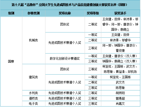近日,第十八届“高教杯”全国大学生先进成图技术与产品信息建模创新大赛成绩公布,beat365中文官方网站代表队在机械、建筑、水利等多个类别中斩获19项国家级奖项(一等奖5项、二等奖5项、三等奖9项),取得良好成绩。