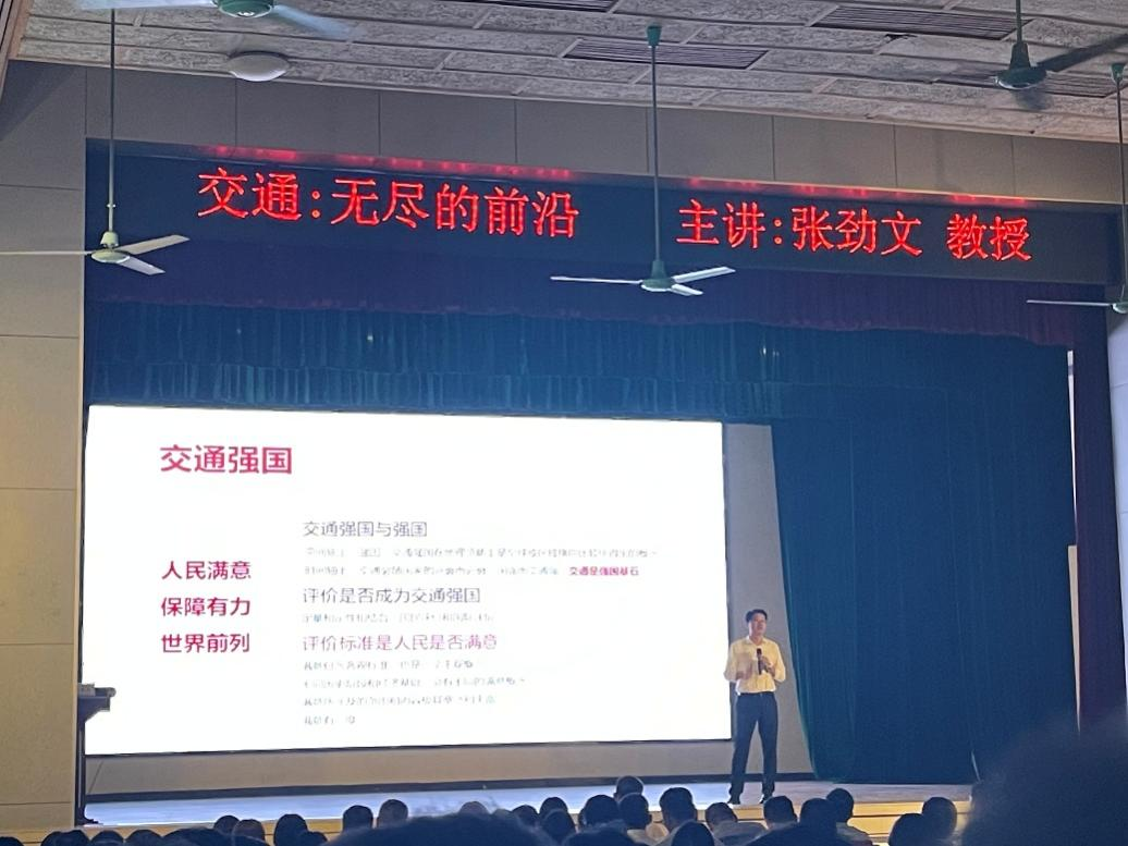 张劲文以“交通,无尽的前沿”为主题,系统地回顾了交通的发展脉络,不仅带领新生领略了早期交通的形态,还引导新生畅想未来的智能交通系统,激发了新生对交通领域前沿发展的兴趣。其间,张劲文着重强调了中国交通在短短几十年间从追赶者到引领者的华丽转身,通过讲述一系列重大交通项目,让同学们深刻感受到交通人敢为人先、勇于创新的精神,激励大家向前辈们学习,在未来的学习与工作中积极进取。