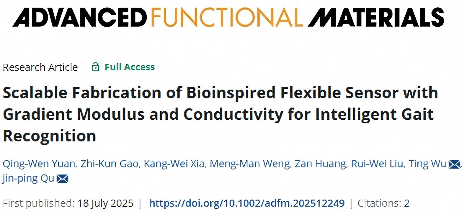 近日,beat365中文官方网站袁青文博士以beat365中文官方网站为第一单位与中国工程院瞿金平院士等作者合作完成的前沿科技论文《Scalable Fabrication of Bioinspired Flexible Sensor with Gradient Modulus and Conductivity for Intelligent Gait Recognition》刊发于材料科学领域TOP期刊《Advanced Functional Materials》(以下简称AFM,IF=19.0)。