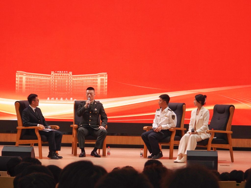 活动期间,3位校友分别介绍了自身的成长轨迹,以实际行动践行新时代青年人的使命担当。时旭天曾服役于中国人民解放军三军仪仗队,多次执行天安门升降国旗的任务,并随队在2019年中华人民共和国成立70周年大阅兵升旗仪式时走过天安门,用亲身经历诠释“红色”家国情怀与军人担当;罗威龙凭借精湛专业技能,斩获省“五一劳动奖章”和“金锚杯”冠军,擦亮广航院学子“蓝色”专业名片;黎炜怡经历了驻港部队的淬炼和纪念中国人民抗日战争暨世界反法西斯战争胜利80周年大会阅兵的荣光,展现了新一代航海人的使命担当。在分享交流环节,3位校友围绕“重回母校感受”“难忘校园记忆”“学业职业规划”等话题畅所欲言。时旭天分享了阅兵经历对他人生的深远影响,罗威龙讲述了专业竞赛带来的成长机遇,黎炜怡畅谈了从军报国的心路历程。校友们还就同学们提出的职业认知、能力培养、学业规划等问题耐心解答并给出宝贵建议,现场气氛热烈。