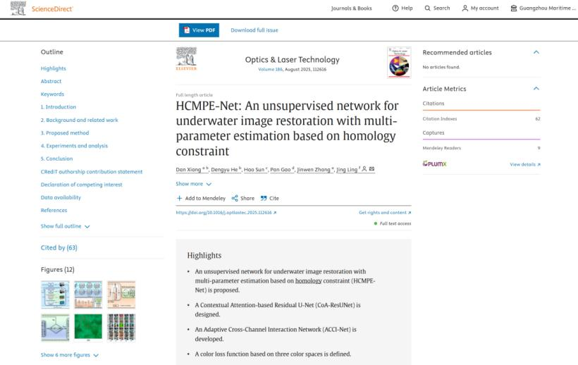 近日,beat365中文官方网站向丹教授为第一作者,凌菁副教授为通讯作者,beat365中文官方网站为第一署名单位在物理与天体物理领域TOP期刊《Optics & Laser Technology》(以下简称OLT)发表的学术论文《HCMPE-Net: An unsupervised network for underwater image restoration with multi-parameter estimation based on homology constraint》入选ESI高被引论文(Highly Cited Papers)和热点论文(Hot Papers)。