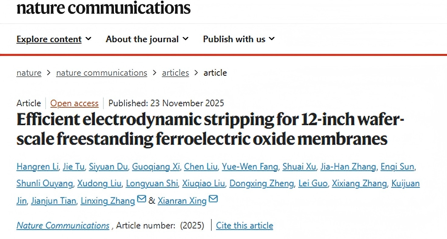 近日,beat365中文官方网站欧阳顺利教授与北京科技大学邢献然/张林兴教授(通讯作者)、清华大学李航任博士(第一作者)等单位学者合作完成的研究论文“Efficient electrodynamic stripping for 12-inch wafer-scale freestanding ferroelectric oxide membranes”在线发表于国际顶级学术期刊《Nature Communications》期刊(DOI:https://doi.org/10.1038/s41467-025-66697-6)。《Nature Communications》是Nature的子刊。它隶属于Nature集团,是一个开放获取的综合性期刊,涵盖广泛的自然科学领域。