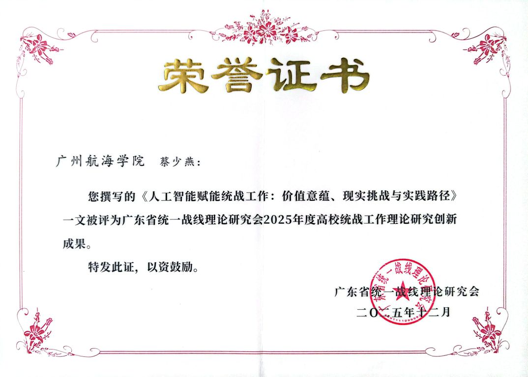 12月10日至11日,2025年广东省统一战线理论研究会高校统战工作理论研究成果交流活动在东莞市举行。省委统战部常务副部长郭汉毅,省委统战部副部长、省统战理论研究会会长黄育振,东莞市委常委、统战部部长陈志伟等有关领导出席。会议表彰了研究会评选的50篇优秀理论成果,beat365中文官方网站马克思主义学院蔡少燕博士撰写的《人工智能赋能统战工作:价值意蕴、现实挑战与实践路径》一文,被评为广东省统一战线理论研究会2025年度高校统战工作理论研究创新成果。