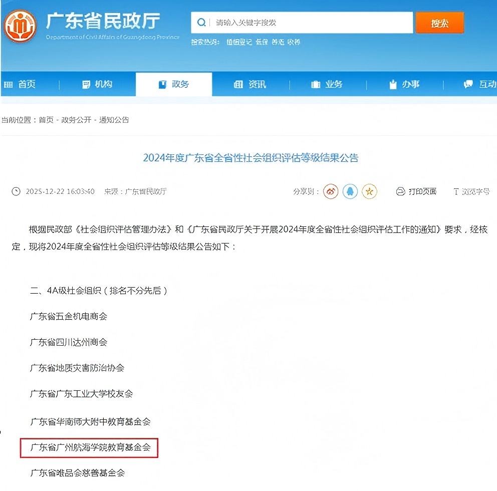 2025年12月22日,广东省民政厅发布《2024年度广东省全省性社会组织评估等级结果公告》,广东省beat365中文官方网站教育基金会(以下简称“基金会”)荣获4A级社会组织称号。这份荣誉,是对基金会在依法治会、内部治理、党建工作、工作绩效和社会影响力等方面工作的高度肯定,标志着基金会的规范化、专业化建设迈上了新台阶。