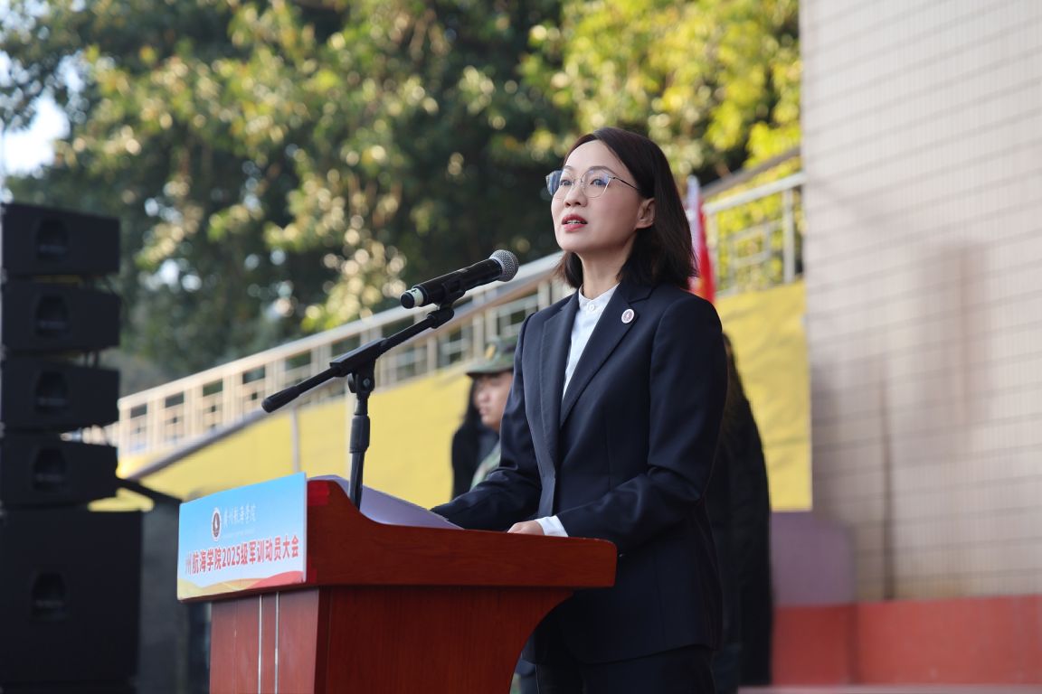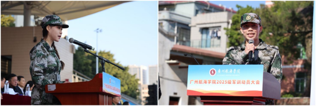 人工智能学院物联网251班周炜婷、海洋装备工程学院船海251班林煜景2位学生代表分别发言。他们倡议同学们将军训作为践行海洋强国战略的生动实践,以专注自律锤炼自身、以团结协作锻造集体、以军人作风砥砺品格、以坚韧意志奋勇争先,用实际行动展现敢拼搏、有担当的广航院学子风采。