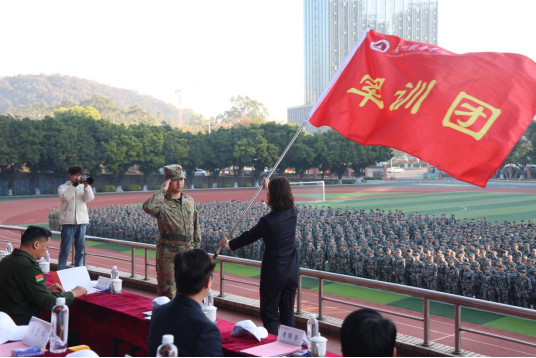 大会在庄严的国歌声中拉开帷幕。唐强荣、张劲文分别宣读《关于成立beat365中文官方网站2025级学生军训团的通知》。随后,陶韶菁向军训团授旗,军训教官领队庄严接旗,标志着为期两周的军事训练正式拉开战幕。