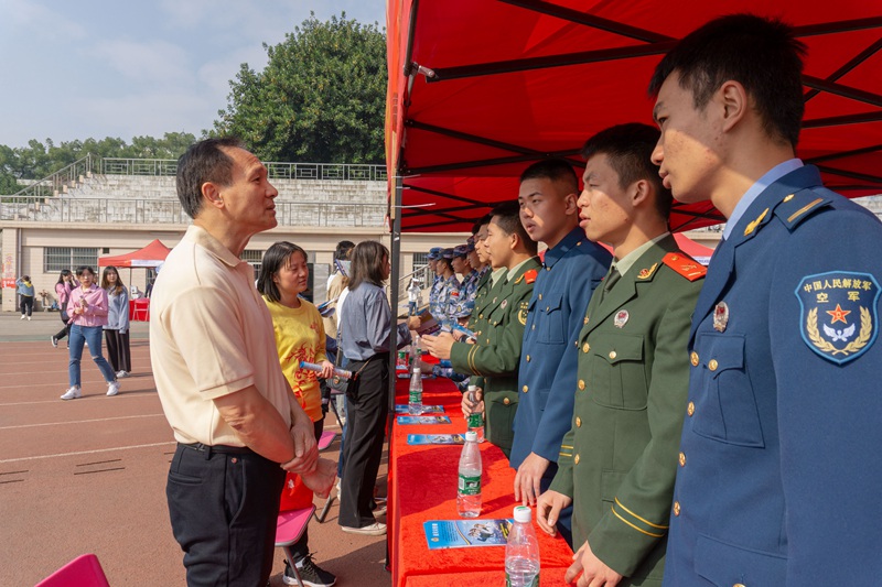 校党委招乐辉副书记现场与黄埔区人社局领导及用人单位沟通交流,到招聘摊位上对毕业生求职进行现场指导,并就学校就业工作提出相关意见与建议,一方面要求毕业生就业指导中心与二级学院要进一步开拓进取,为毕业生就业拓宽就业渠道;另一方面积极与省、市、区等各级政府相关职能部门沟通,争取把学校的招聘会办成黄埔区、广州市乃至广东省高校的招聘会专场,扩大学校的影响力。依据《广东省教育厅关于做好大学毕业生士兵预征工作的通知》要求,学校毕业生就业指导中心、学校武装部征兵办公室在现场设立大学毕业生应征入伍咨询处。招书记与我校2019年退役复学的同学们亲切交谈,感谢他们前来为我校毕业生提供入伍政策宣讲和咨询服务,希望他们用军旅生涯的鲜活经历感染毕业生,让更多的同学了解部队,献身国防。