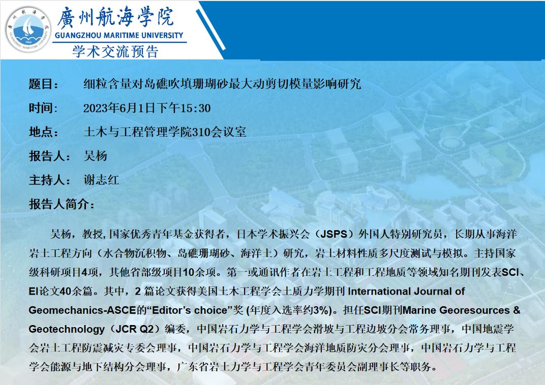 吴杨教授学术讲座预告——细粒含量对岛礁吹填珊瑚砂最大动剪切模量影响研究