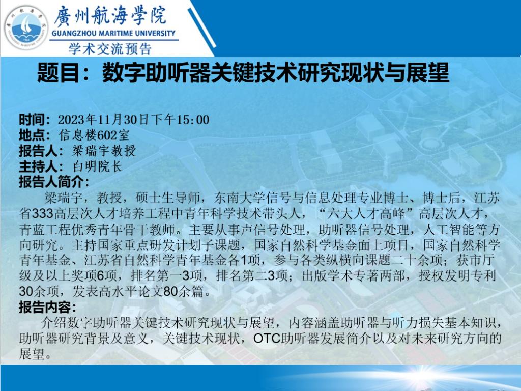 学术讲座预告——梁瑞宇教授《数字助听器关键技术研究现状与展望》