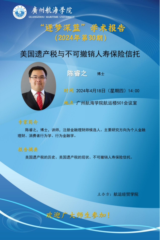“逐梦深蓝”学术讲座预告(第30期):陈睿之《美国遗产税与不可撤销人寿保险信托》