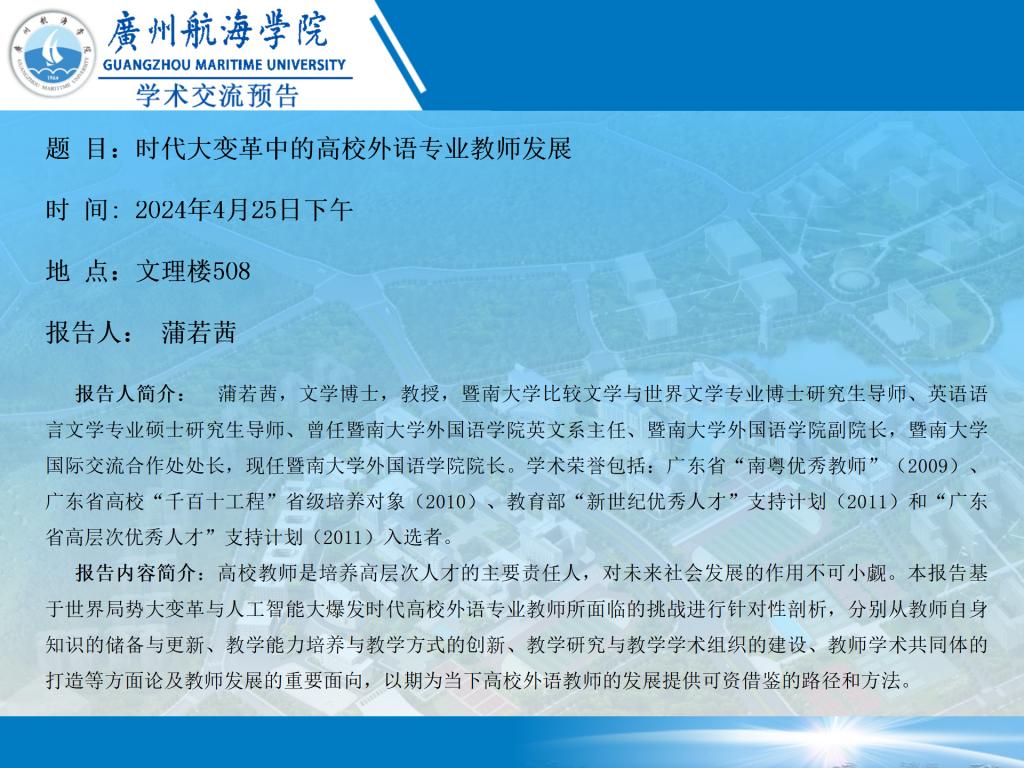 学术讲座预告:蒲若茜《时代大变革中的高校外语专业教师发展》