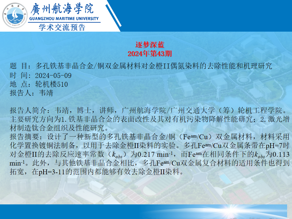 “逐梦深蓝”学术讲座预告:韦靖博士《多孔铁基非晶合金/铜双金属材料对金橙II偶氮染料的去除性能和机理研究》