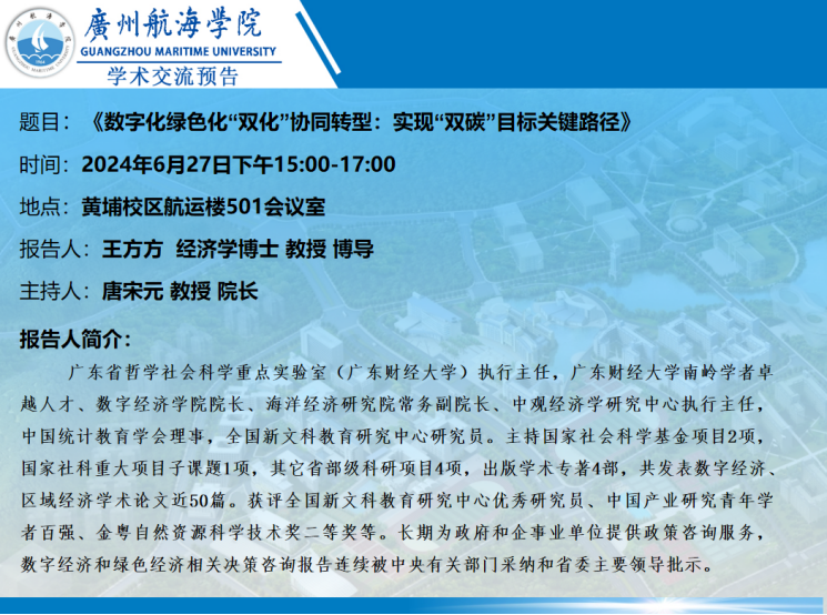 学术讲座预告:王方方博士、教授《数字化绿色化“双化”协同转型:实现“双碳”目标关键路径》