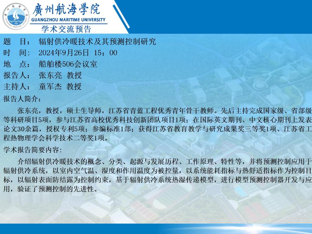 学术讲座预告:张东亮教授《辐射供冷暖技术及其预测控制研究》