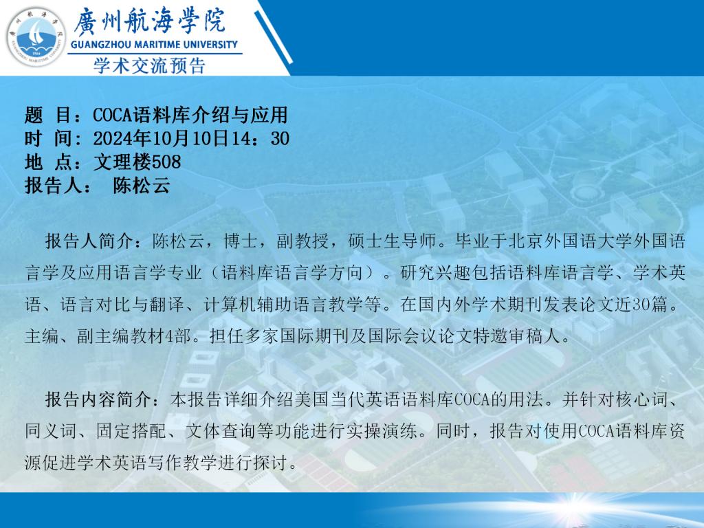 “逐梦深蓝”学术讲座预告:陈松云《COCA语料库介绍与应用》