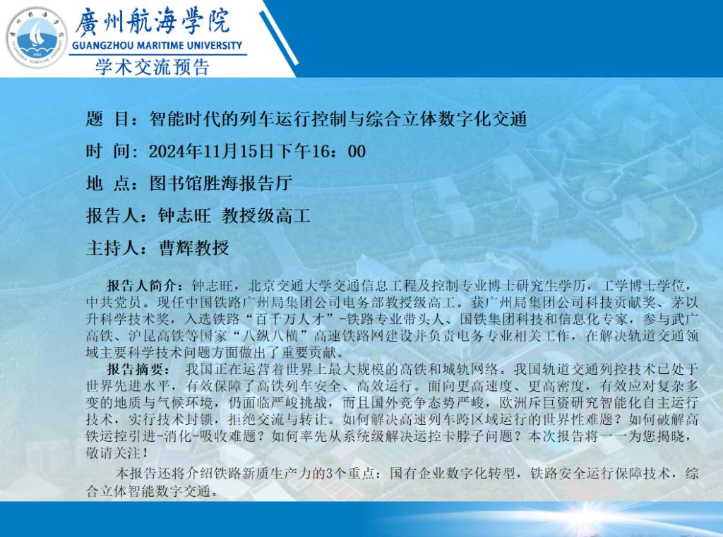 学术讲座预告:钟志旺教授《智能时代的列车运行控制与综合立体数字化交通》
