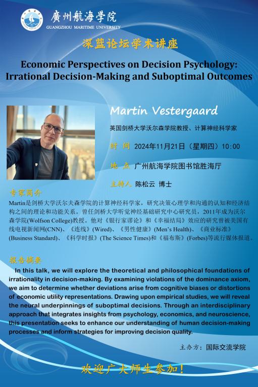 深蓝论坛学术讲座:Martin Vestergaard《Economic Perspectives on Decision Psychology: Irrational Decision-Making and Suboptimal Outcomes》