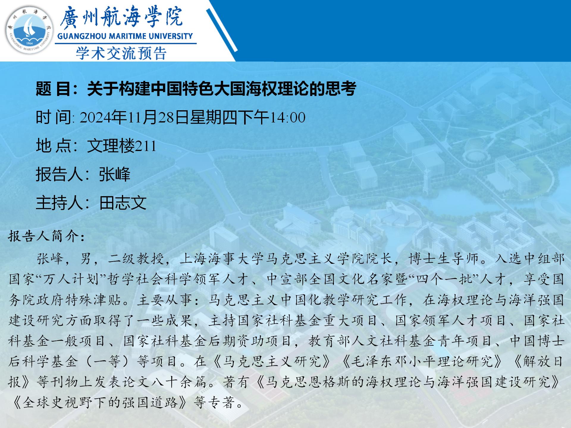 学术讲座预告:张峰《关于构建中国特色大国海权理论的思考》