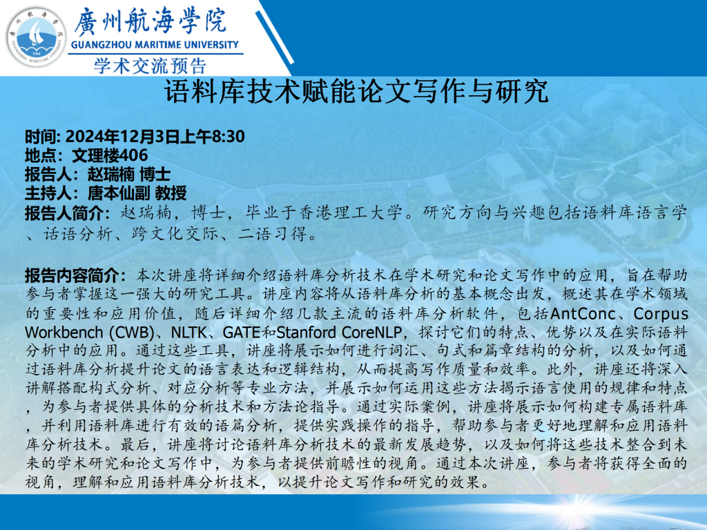 “逐梦深蓝”学术讲座预告:赵瑞楠《语料库技术赋能论文写作与研究》