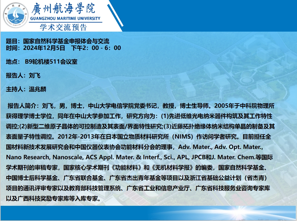 学术讲座预告:刘飞教授《国家自然科学基金申报体会与交流》