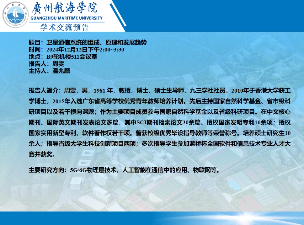 学术讲座预告:周雯教授《卫星通信系统的组成、原理和发展趋势》