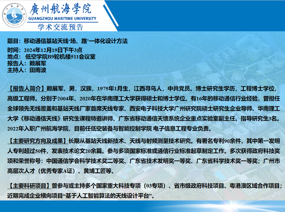 “低空翱翔”系列学术预告:赖展军高级工程师《移动通信基站天线‘场、路’一体化设计方法》