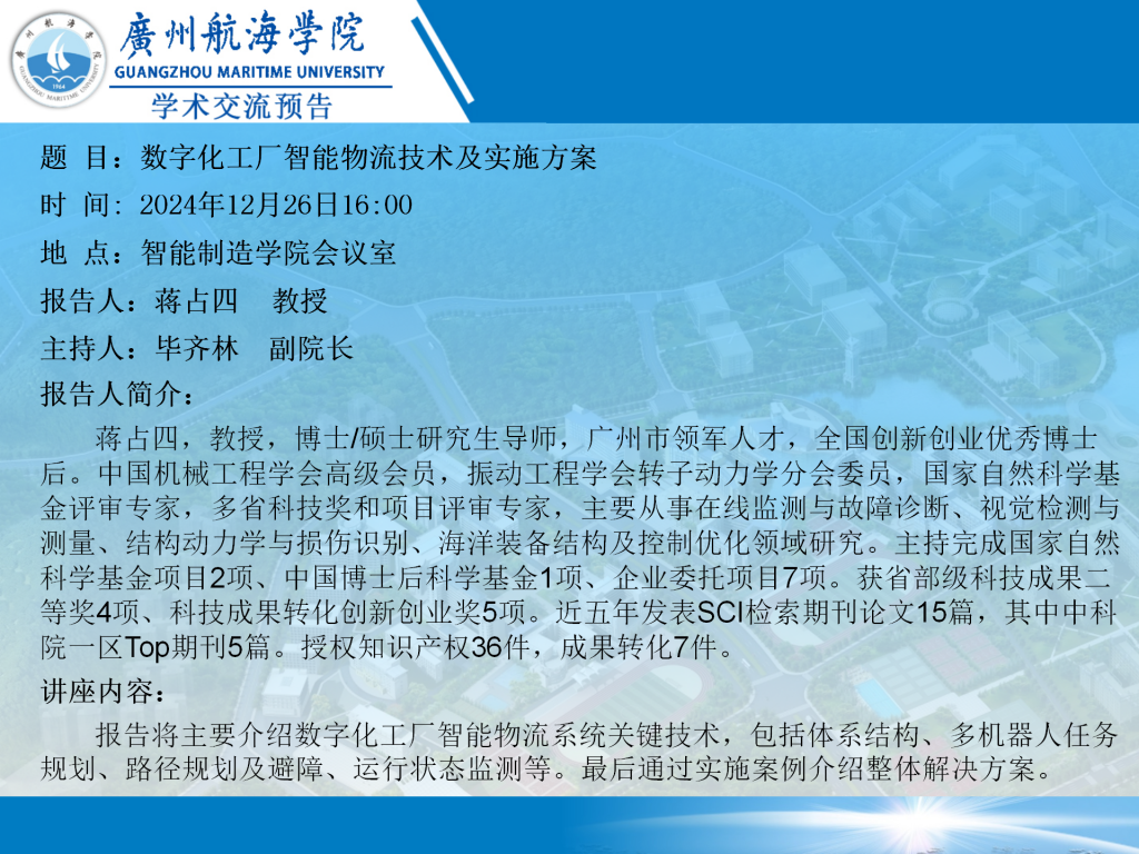 学术交流预告:蒋占四教授《数字化工厂智能物流技术及实施方案》