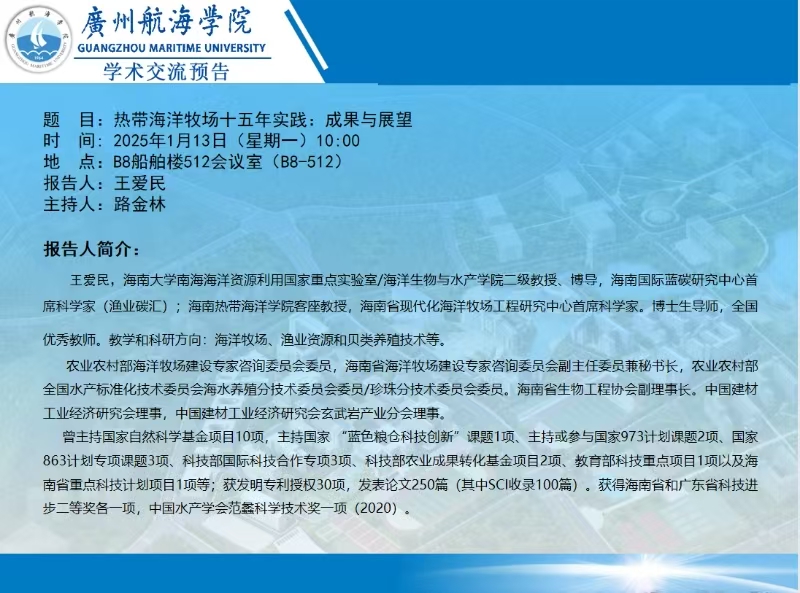 学术讲座预告:王爱民《热带海洋牧场十五年实践:成果与展望》