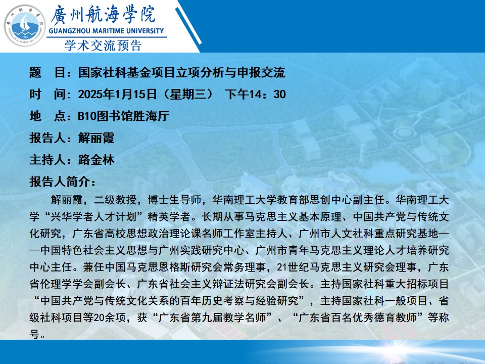 学术讲座预告:解丽霞《国家社科基金项目立项分析与申报交流》