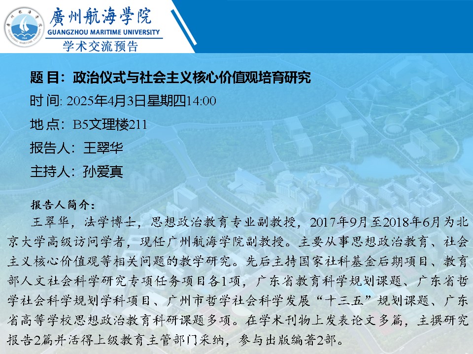 学术讲座预告:王翠华《政治仪式与社会主义核心价值观培育研究》