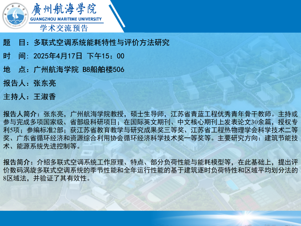 学术讲座预告:张东亮《多联式空调系统能耗特性与评价方法研究》
