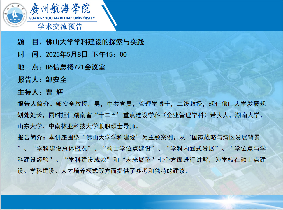 学术讲座预告:邹安全《佛山大学学科建设的探索与实践》