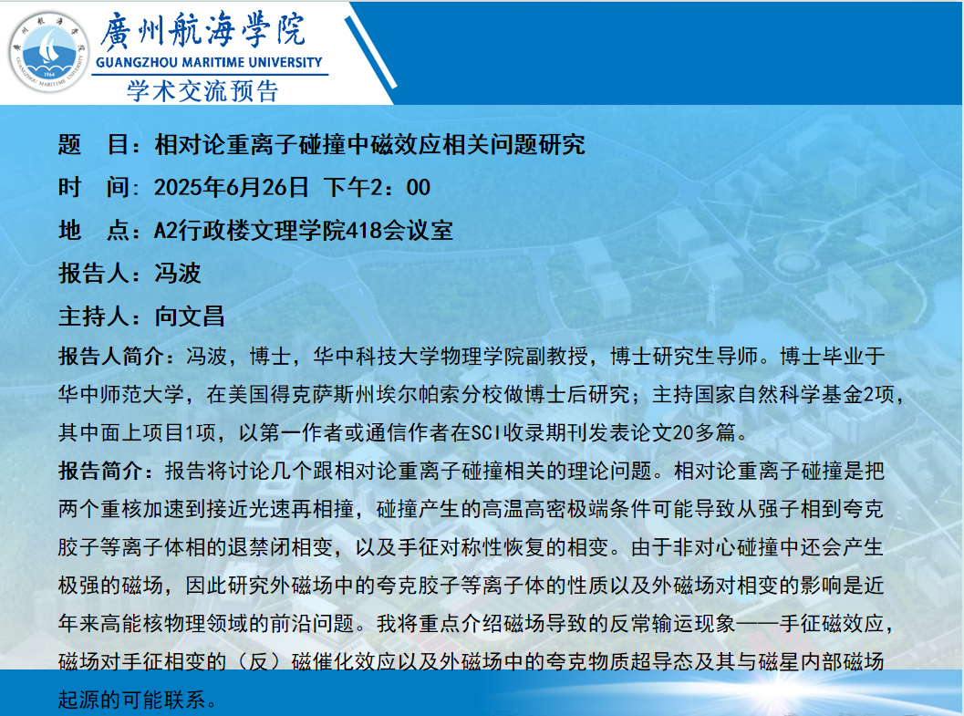 学术讲座预告:冯波《相对论重离子碰撞中磁效应相关问题研究》