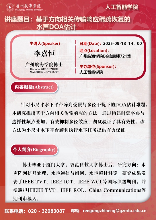 学术讲座预告:李嘉恒《基于方向相关传输响应稀疏恢复的水声DOA估计》