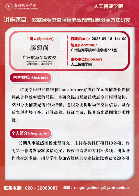 学术讲座预告:廖建尚 《双路径状态空间模型高光谱图像分类方法研究》